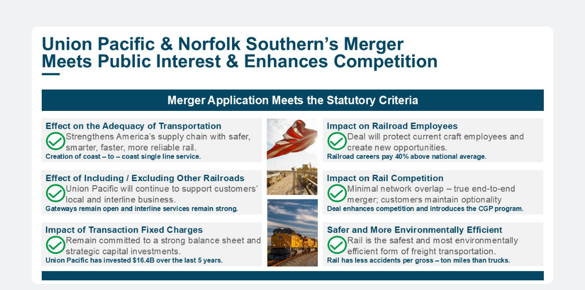 Union Pacific and Norfolk Southern are proposing a single, integrated freight rail network to strengthen the U.S. supply chain, enhance competition and support long-term growth for customers, communities and the national economy.
