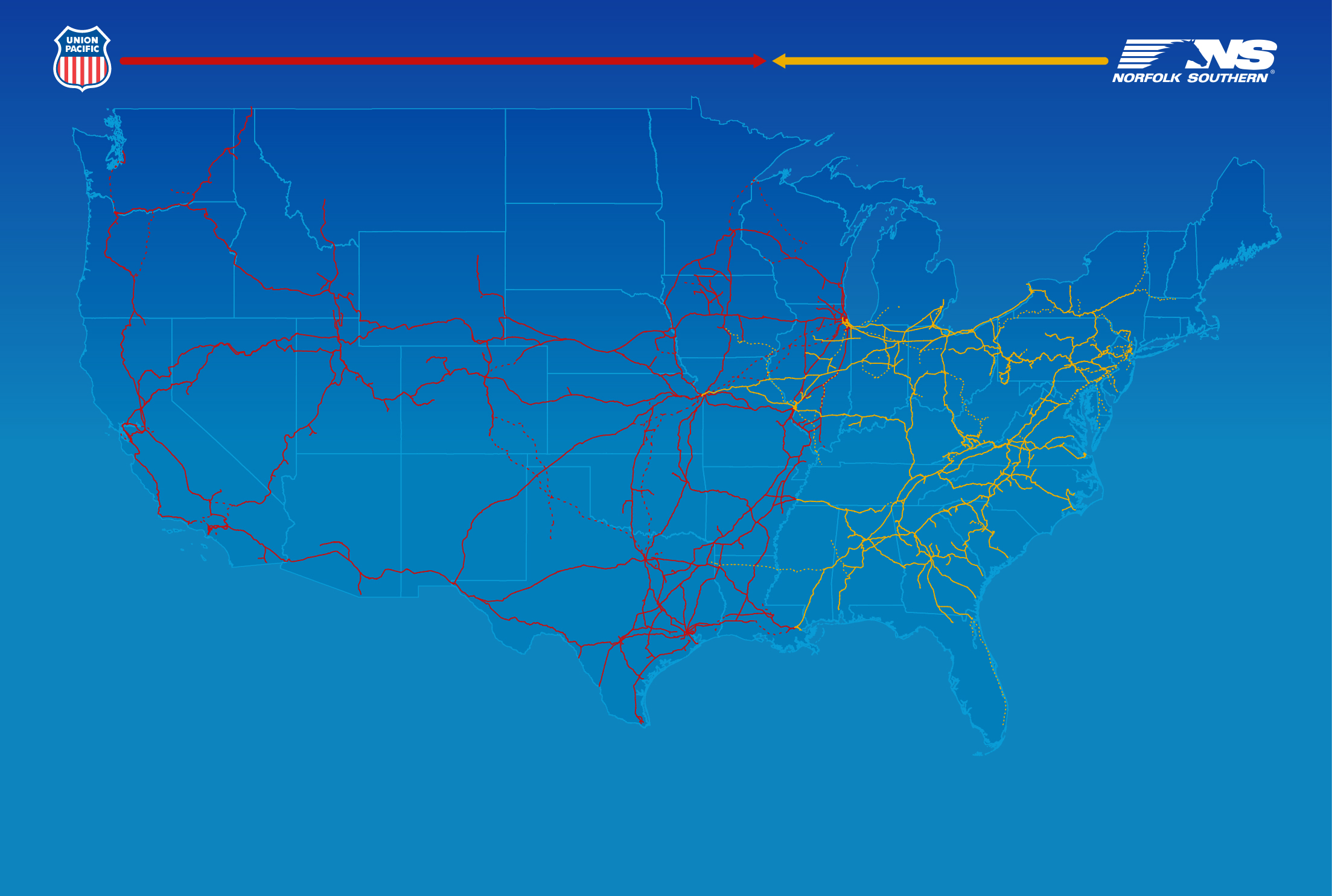 Union Pacific and Norfolk Southern are creating a straightforward fix. By combining into a single transcontinental system, that longstanding break in the network will be replaced by seamless, single-line service. This will lead to lower total transportation costs, faster transit times and more consistent, dependable service.